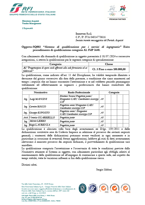 CERTIFICAZIONI ISO 9001:2015 VISUALIZZA PDF ISO 14001:2015 VISUALIZZA PDF ISO 45001:2018 VISUALIZZA PDF UNI/PDR 125 2022 VISUALIZZA PDF QUALIFICAZIONE RFI VISUALIZZA PDF Politica per la QualitàLa società INNOVUS S.r.l. opera nel settore dei servizi ed attività di commesse inerente la PROGETTAZIONE, DIREZIONE LAVORI E COORDINAMENTO DELLA SICUREZZA VISUALIZZA PDF